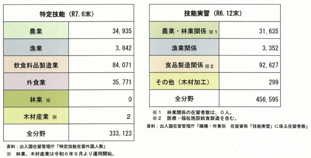 なお、出入国在留管理庁の調べによると、2024年末時点の農林水産業における技能実習生の人数(在留者数)は45万6,595人となっているが、林業関係の在留者はゼロ。特定技能に関しても、2025年6月末時点の林業関係の在留者はゼロ、木材産業は2人にとどまっている(参照)。