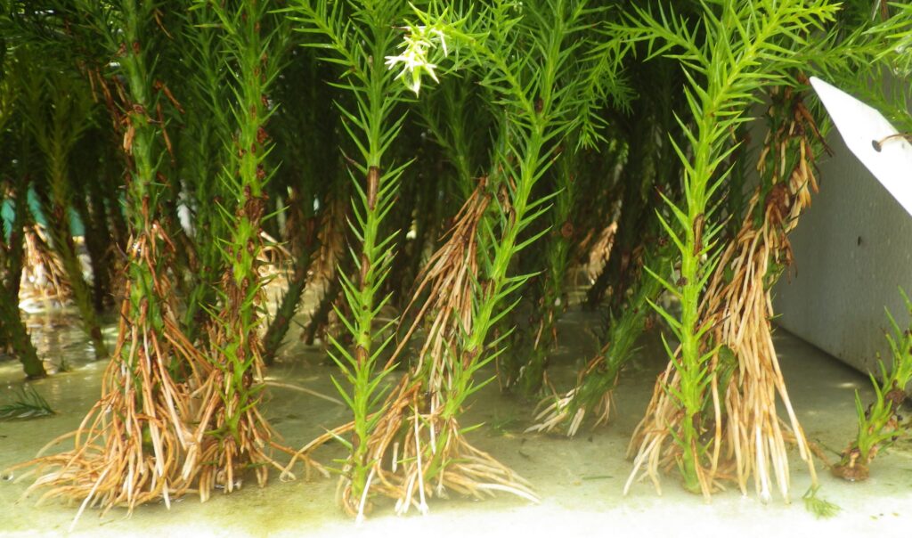 新開発した手法では、さし穂全体を空気中に露出するように立て、定期的にミスト散水することによって、安定的な発根が可能となり、発根の状態もリアルタイムで確認できる。さし木苗づくりにつきものの重筋労働から解放されるのは大きなメリットとなる。