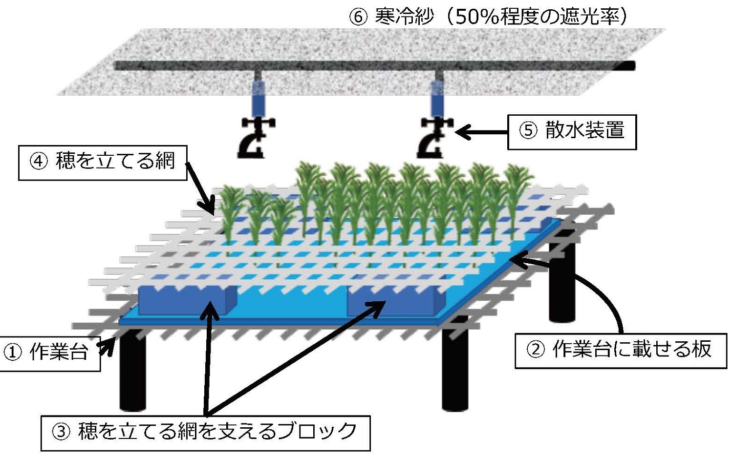 (トップ画像=発砲スチロール製ブロックとメッシュパネル等でつくった支持装置にスギのさし穂を立て、定期的にミスト散水をして苗木を育てる)