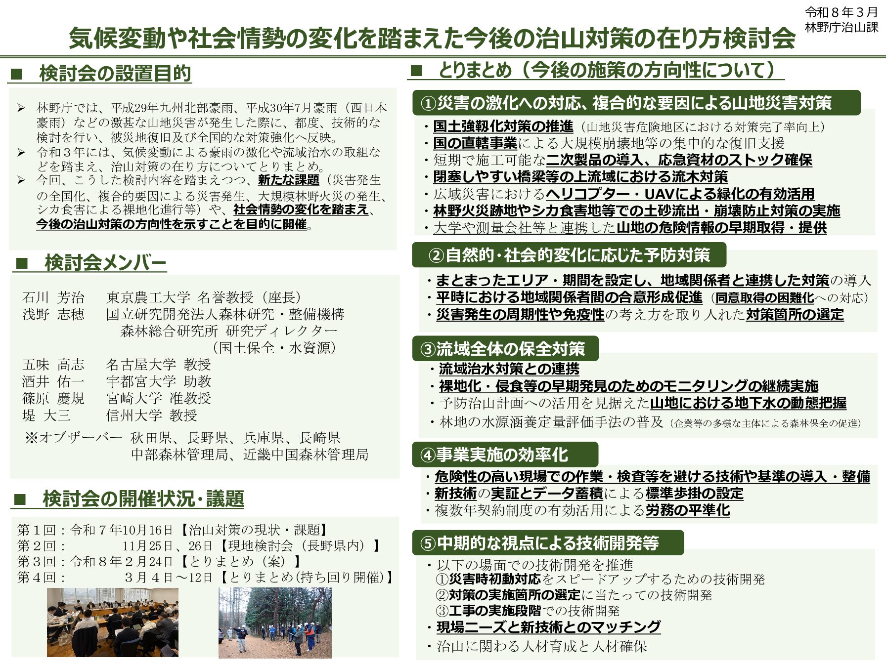 林野庁が設置していた「気候変動や社会情勢の変化を踏まえた今後の治山対策の在り方検討会」(座長=石川芳治・東京農工大学名誉教授)は、現地視察を含めて4回に及んだ会合の成果をとりまとめ、3月27日に公表した。