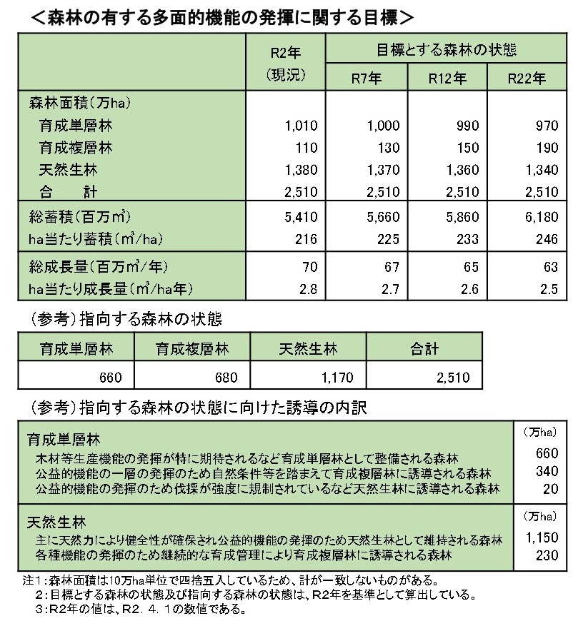 併せて林野庁は、20年後までを視野に入れた国内森林の誘導目標値(目標とする森林の状態)についても見直しを行った。現行計画から大きな変更はなく、育成単層林から育成複層林への誘導ペースの遅れを取り戻すことを数値設定に盛り込んだ。