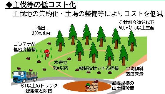 「大きな林業」の対象エリアでは、森林所有者と林業事業体が10年程度の長期一括契約を結んで、コンテナ苗や最新の林業機械・機器などを使った低コスト林業を進めることにしており、今年度から県内10か所で実証事業に着手している。一方、「小さな林業」については、自伐型林業を目指す移住者への給付金や研修・技術指導、副業化(半林半X)などに関する支援策を講じていく。4月には福井市内で自伐型林業大学校が開校し、これまでに県外者28名を含めた34名が受講しており、飯田グループホールディングスの協力などを得ながら、自立に向けたサポートを手厚くしていくことにしている。