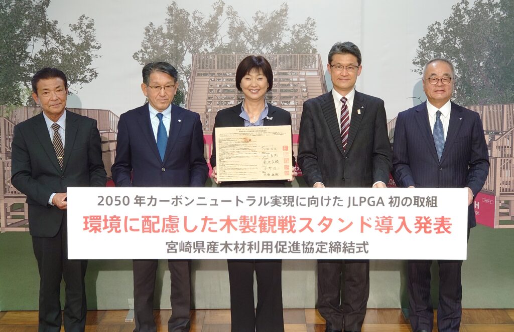 同協定を踏まえて、11月24日に宮崎市の宮崎カントリークラブで開幕する「JLPGAツアーチャンピオンシップリコーカップ」において、県産のスギを使った木製観戦スタンドを初めて設置する。同スタンドには、県産スギを丸太換算で500本分使用し、補強用の金物を一部で使う以外はオール木製とする。1番ホールと18番ホール及び練習場に計約1,080人分を設置し、来年以降も使用していく方針。