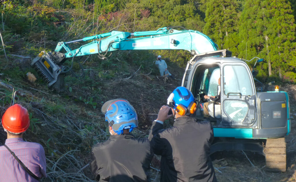 造林機械の比較デモでは、(株)筑水キャニコム(福岡県うきは市)の多目的造林機械「山もっとモット」、筑波重工(株)(岩手県洋野町)の車高調整式下刈り機械「ハイドロマチック・モア」、イタリア・FAE社製のアタッチメントを装着した「マルチャー」が現場作業にあたった。