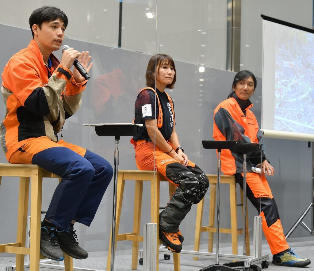 トークショーではフォレストワーカーの代表が実体験を通じて得られた山で働く意義などを伝え、「日本伐木チャンピオンシップ2022」のレディースクラスで優勝した岡田望さんも登壇して林業の現状などを語った。