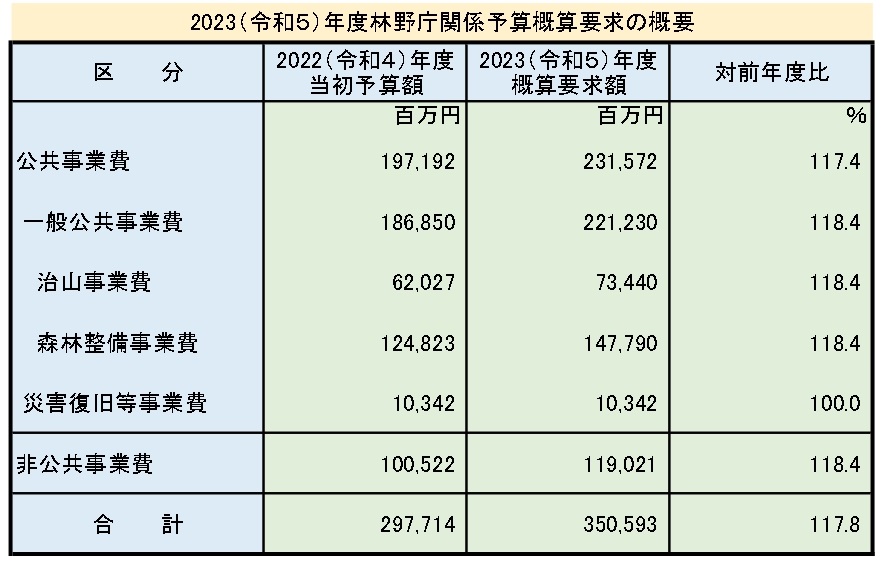 2023年度林野庁関係予算要求は約3,506億円 前年度比17.8%増