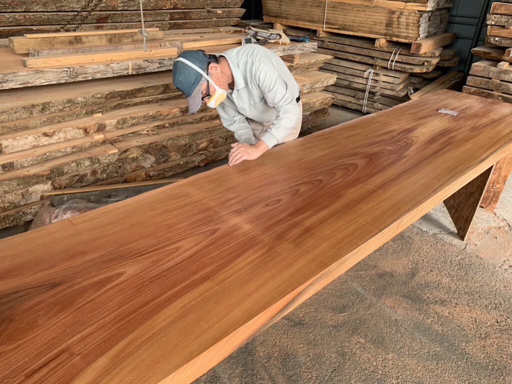 これまでケヤキは、社寺仏閣用材や個人邸宅の化粧柱などに使われてきた。だが、こうした需要は先絞りの傾向にある。そこで寺島社長は、飲食店のカウンターやテーブル用としてケヤキの利用を広げようとしている。
