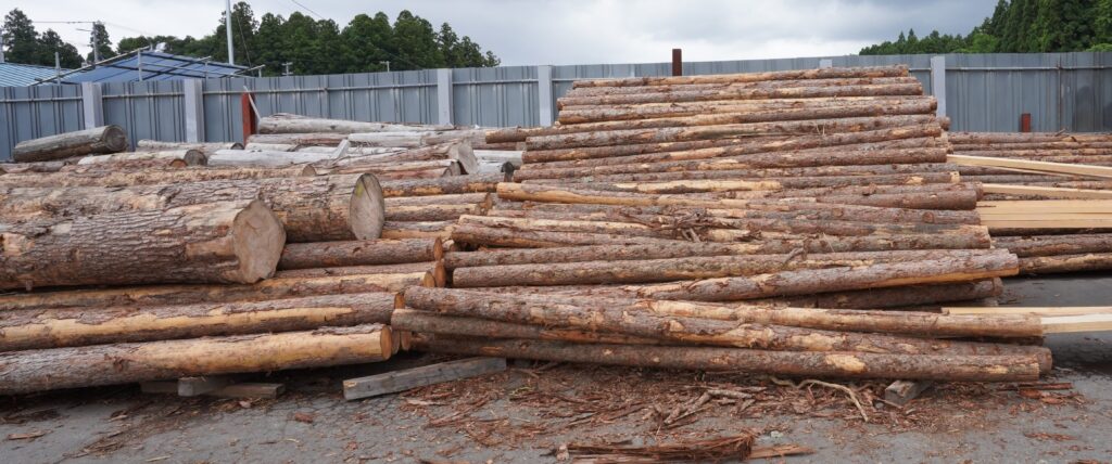 土場に積まれている原木は、最長8m、直径30cm以上のスギ、ヒノキ、アカマツ、カラマツ、モミ、ケヤキ、クリなど。東北や北海道、関東などから調達したものだ。