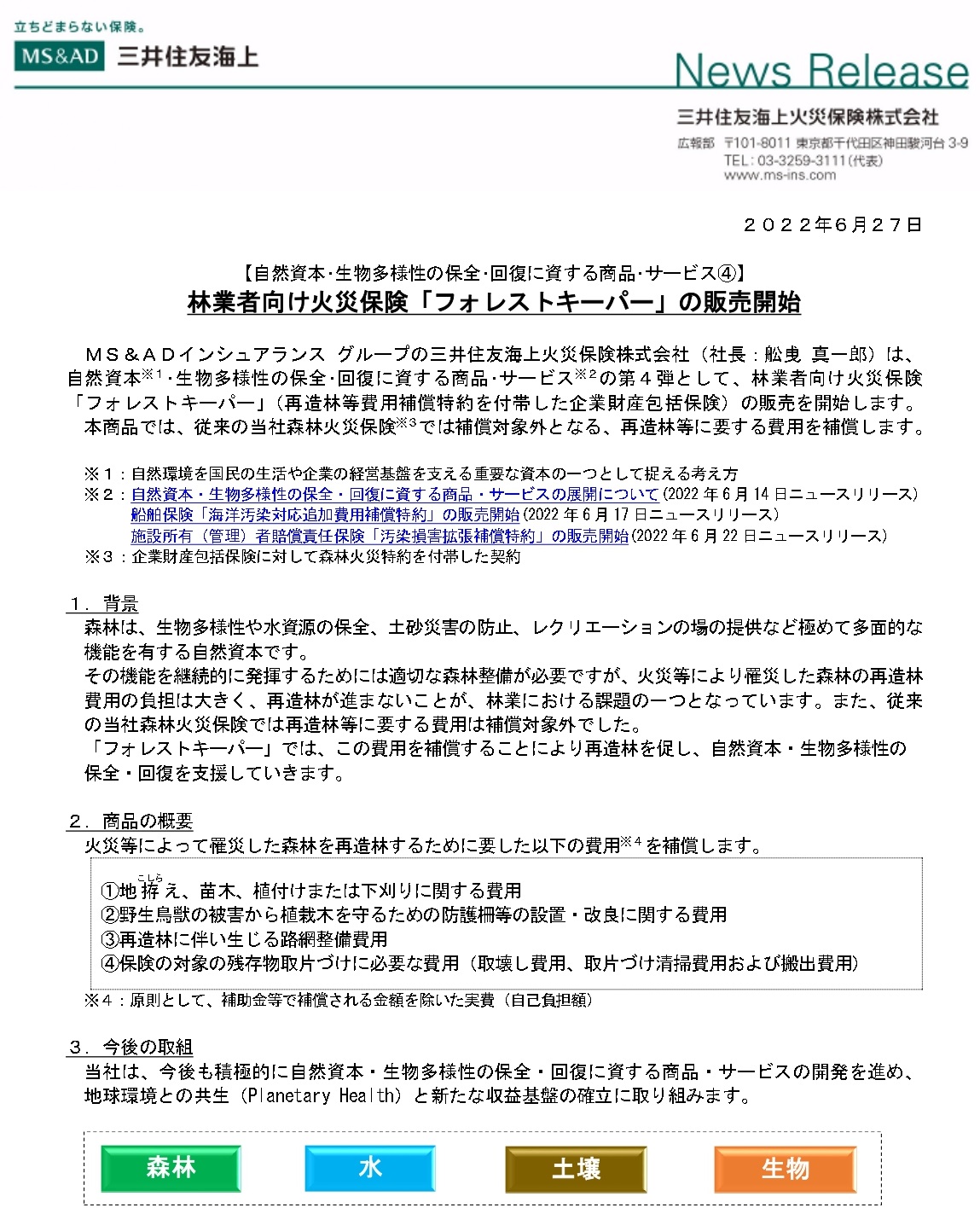 MS&ADインシュアランスグループの三井住友海上火災保険(株)(東京都千代田区)は、再造林などに必要な費用を補償する林業者向け火災保険「フォレストキーパー」の販売を開始した(6月27日に発表)。単独の保険商品ではなく、自然災害などで発生した事故に対して補償する企業財産包括保険の特約として新設した。同社の森林火災保険(森林火災特約を附帯した契約)では、再造林等に関する費用は補償の対象外となっていた。