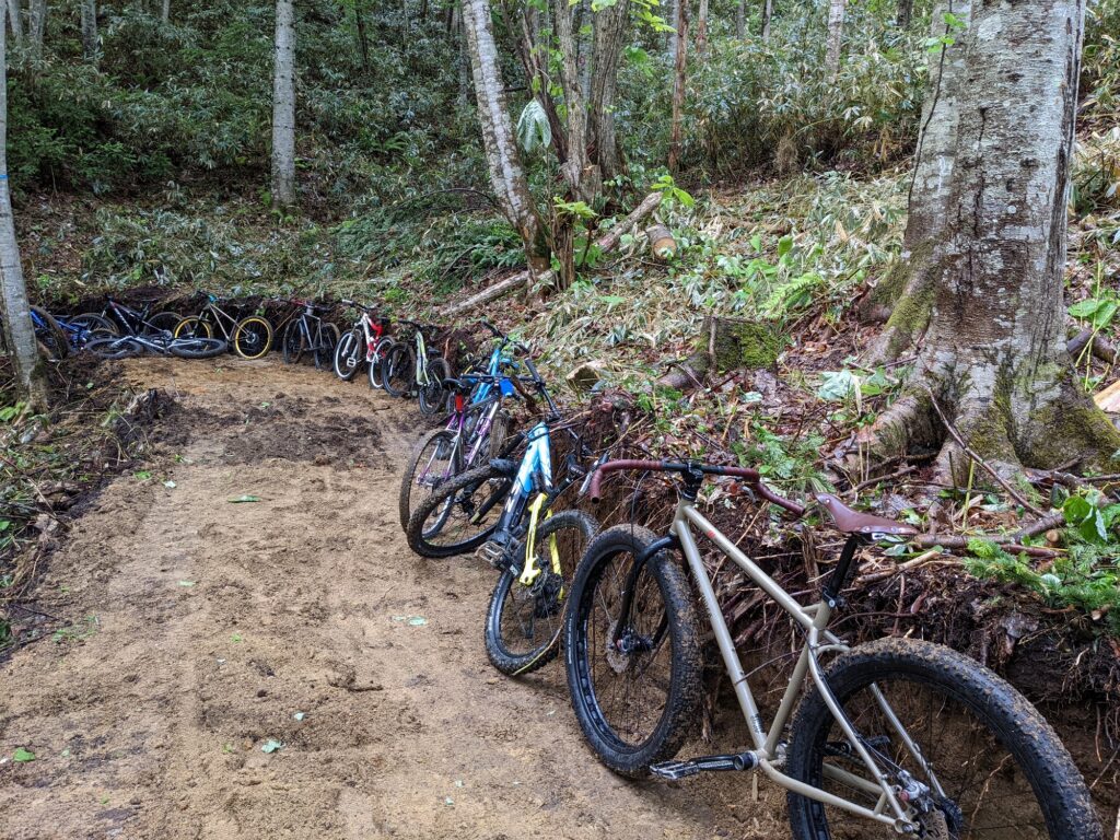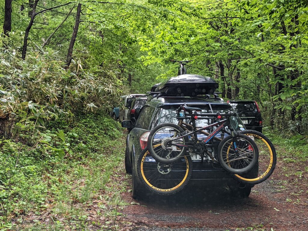 マウンテンバイクを積んだ車が次々と学校林の中に入っていく