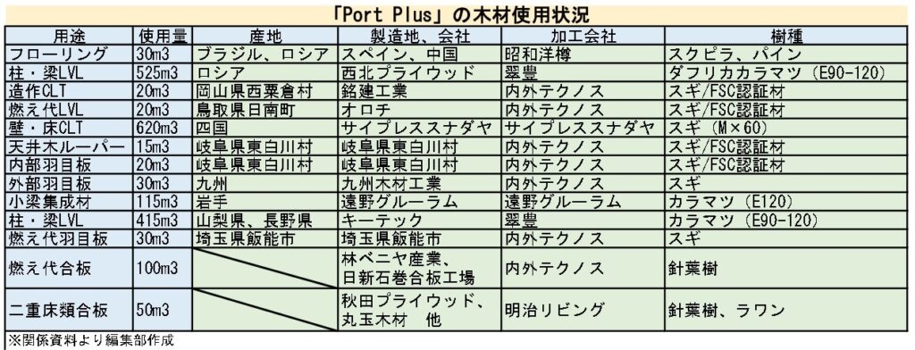 「Port Plus」の高さは44m、延床面積は3502.87m2。使用木材量は1,990m3で、このうち構造材が1,675m3、内装材が315m3となっている。国内外で生産された様々な木材製品を適材適所で利用しており、調達先も公開している(表参照)。