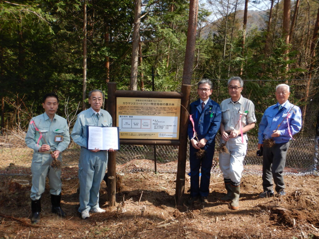 全国初となるカラマツエリートツリー特定母樹の展示林(採種園)が長野県伊那市に設定され、4月12日に植樹セレモニーが行われた。中部森林管理局、長野県、伊那市、林木育種センターが3月31日に締結した「カラマツエリートツリー特定母樹の円滑な普及に向けた覚書」に基づく取り組みの一環。