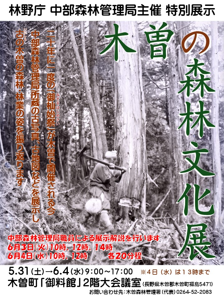 中部森林管理局は、5月31日(土)から6月4日(水)まで長野県木曽町の御料館(旧帝室林野局の建物)で特別展示「木曽の森林文化展」を開催する。6月3日(火)に実施される20年に一度の「御杣始祭」にあわ