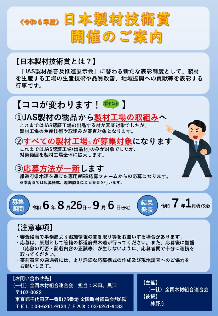 全国木材組合連合会は、初めてとなる「日本製材技術賞」の受賞者を決定した(1月 24 日に発表)。同技術賞は、2022年度まで開催してきたJAS製材品普及推進展示会に替わる表彰制度として、今年度(2024年度)から実施している。