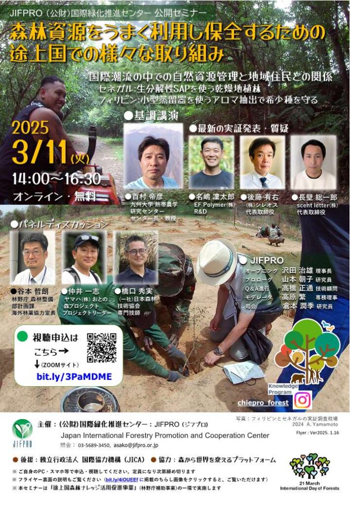 国際緑化推進センター(JIFPRO)は、3月11日(火)午後2時からオンラインセミナー「森林資源をうまく利用して保全するための途上国での様々な取り組み」を開催する。九州大学熱帯農学研究センター長・教授の百村帝彦氏が基調講演し、セネガルにおける生分解性SAPを使う乾燥地植林と、フィリピンでの小型蒸留器を使うアロマ抽出について報告した後、パネルディスカッションを行う。参加費無料。→詳しくは、こちら