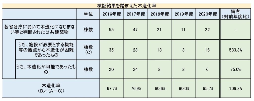金子農相が本部長をつとめる木材利用促進本部は、3月31日に2回目の会合を開き、改正木材利用促進法に基づく取り組みの進捗状況などを検証。国(中央省庁)が整備する低層公共建築物(3階建て以下)の2020年度の木造化率は、棟数ベースで85.7%だったことが報告された(トップ画像(表)参照)。前年度(2019年度)の86.7%からは1.0%減少したが、8割台の水準は維持した。また、「木造化になじまない」と判断された物件を検証した後の木造化率は95.7%となり、3年連続で9割を超えた(下の表参照)。