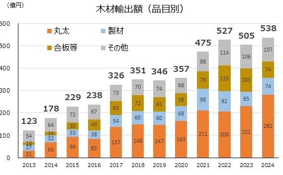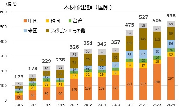 木材輸出額は7%増の538億円、中国向け丸太がトップ