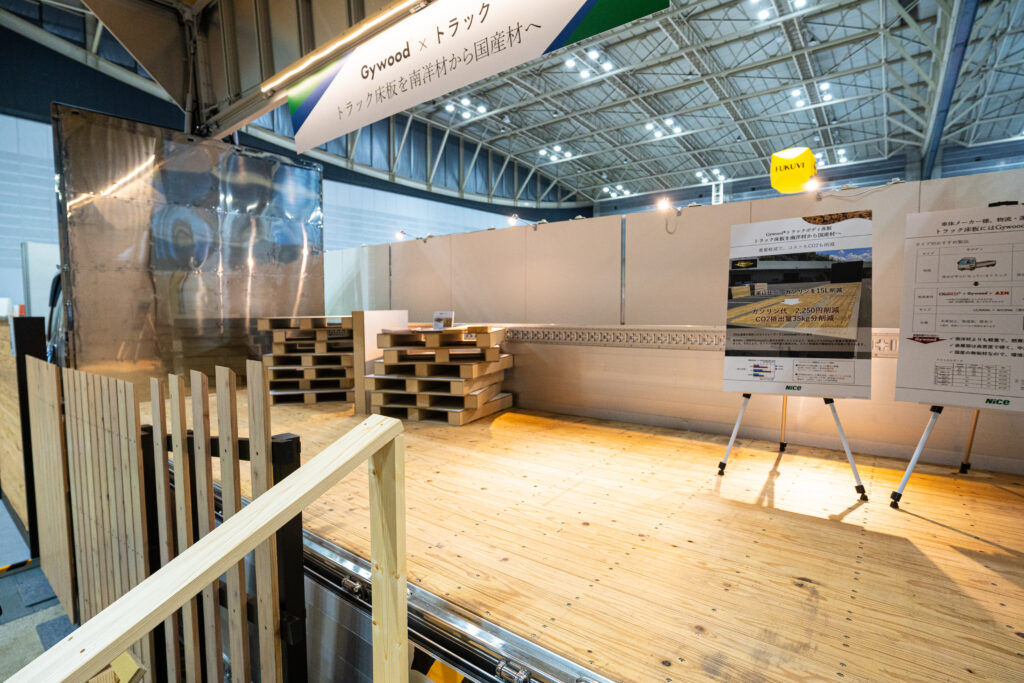 また、トラックの床板を輸入材から「Gywood」に切り替えると、約200kgの軽量化が図られ、燃費も改善するなどの効果が確認されている。