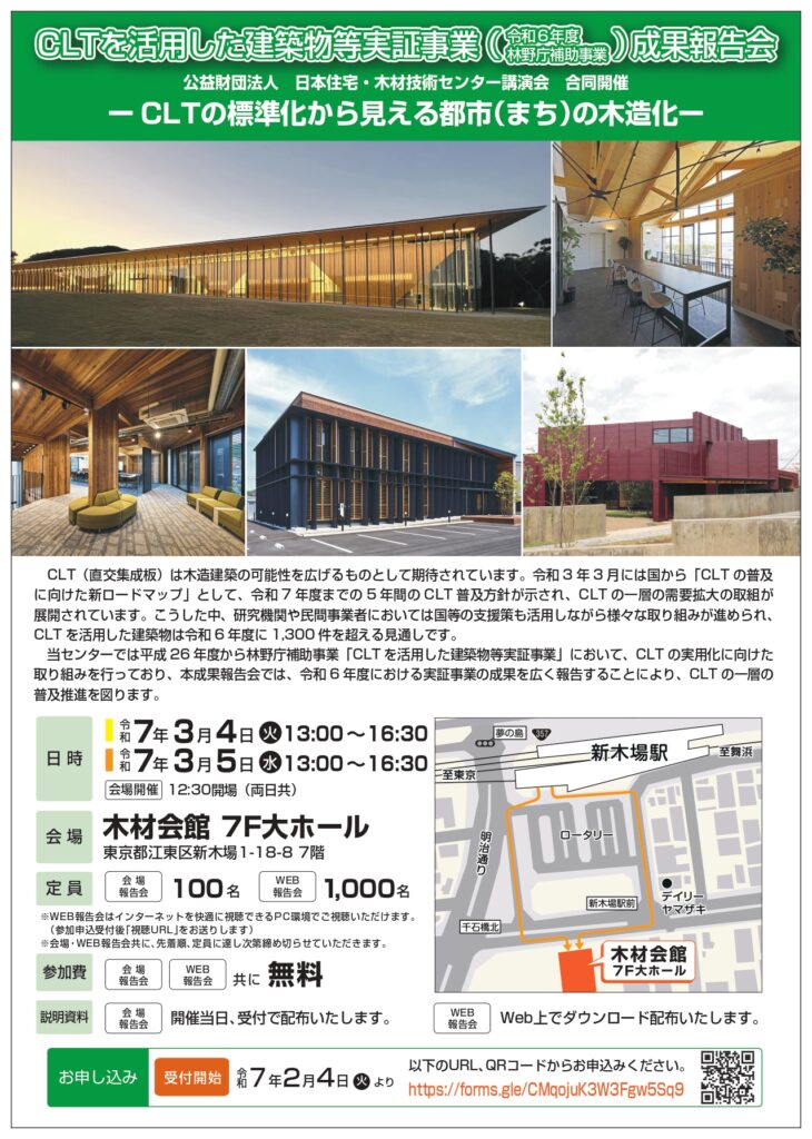 木構造振興(株)と日本住宅・木材技術センターは、3月4日(火)・5日(水)に東京都江東区の木材会館で今年度(2024年度)の「CLTを活用した建築物等実証事業成果報告会」を開催し、オンライン配信も行う(両日とも午後1時開始)。2日間にわたって計25件の建築事例などを発表した後、「CLTの標準化から見える都市(まち)の木造化」をテーマにパネルディスカッションを実施する。参加費無料。→詳しくは、こちら