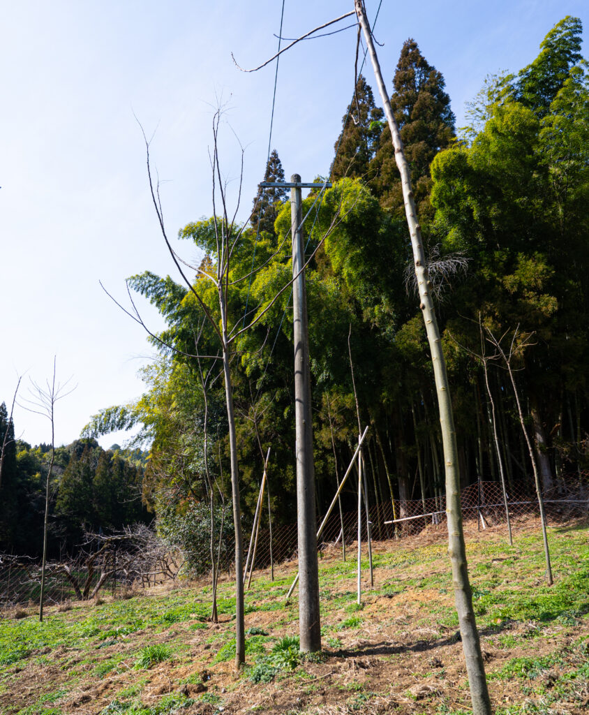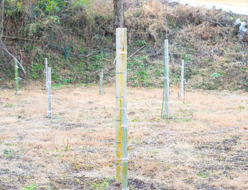 奥村会長は、獣害対策でも新しい試みを行っている。最も新しいセンダン林では、防獣ネットの代わりに、竹でできた保護用の筒を用いている。