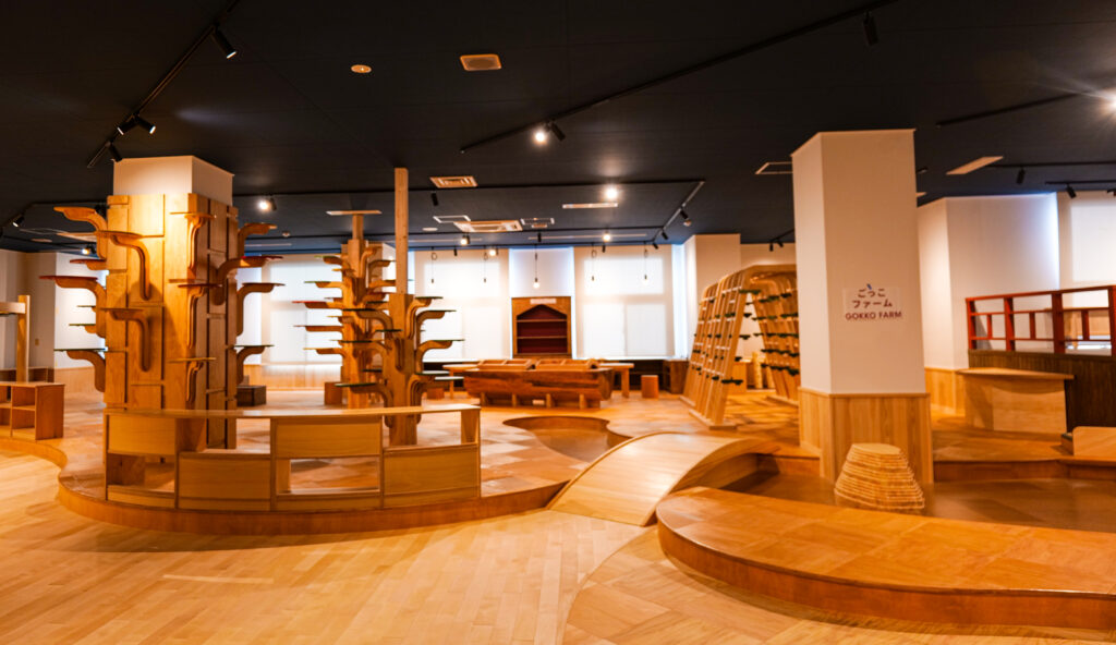 館内には奈良県産のスギ、ヒノキを使用した遊具や玩具を揃えるほか、国内外から厳選した約5,000点の木製玩具も展示する。木材・木製品の供給は、主に森庄銘木産業(株)(奈良県宇陀市、森本定雄社長)が担った。