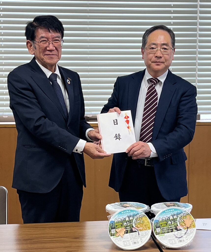 秋田県湯沢市の(株)神室のめぐみ(橋本久信社長)が昨年(2024年)10月に売り出したカップ麺「あきた森林づくりカレーうどん」が昨年末までに完売となり、売り上げの一部である100万円が「あきた未来へつなぐ再造林基金」へ寄付された。