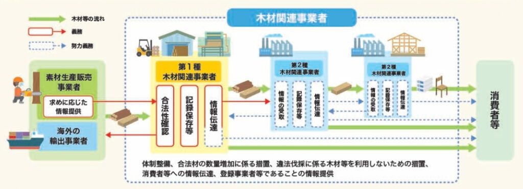 改正後のポイントは、木材流通の最初の段階に位置する原木市場、製材・合単板・チップ工場等と輸入事業者(第1種木材関連事業者)に対して、合法性の確認とともに記録の作成・保存、情報の伝達を義務付けたこと。関連して、素材生産販売事業者には伐採届等の情報提供を義務付け、合法性の確認作業が円滑に行えるようにする。義務に違反した場合は、主務大臣が指導・助言、勧告、公表、命令を行うことができ、命令違反に対しては罰則(100万円以下の罰金)を課すことができる。