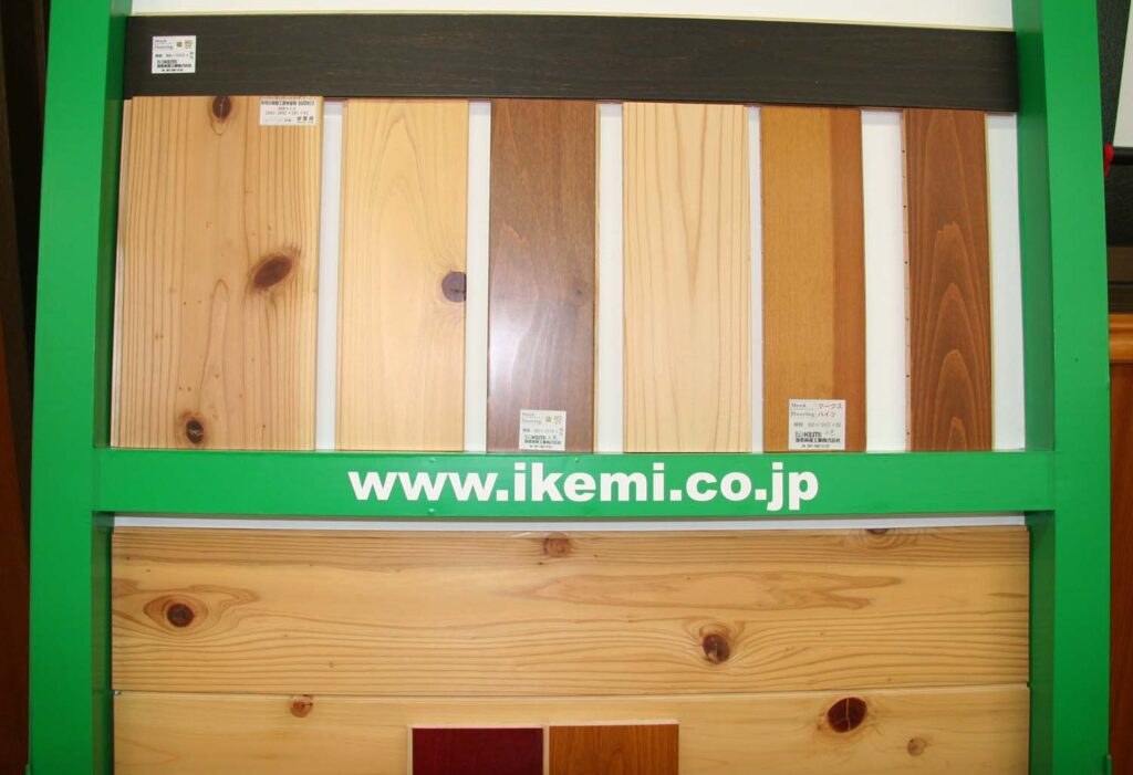 乾燥の徹底化と厳しい品質管理でムク1枚もの板を生産・販売する池見林産には、「桧舞台」(純木桧ムクフローリング)、「ゆかだん桧舞台」(同)、杉並木(純木杉ムクフローリング)、松三宝(松銘木ムクフローリング)など、多彩なラインナップがある。