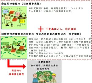 新たな「立木システム販売」は、大口需要などに対応する樹木採取権と一般的な立木販売の中間規模を埋める仕組みとして創設する。