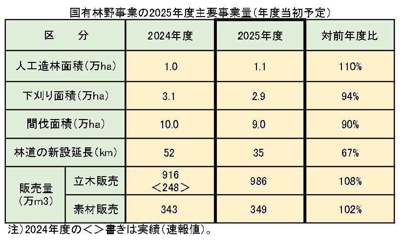 林野庁が国有林で今年度に計画している主要事業量は表のとおりで、立木と素材(丸太)の販売量は前年度を若干上回る数量を予定している。ただし、立木販売については落札率が3割程度にとどまっているため、有識者らで構成する「国有林材供給調整検討委員会」の意見などを踏まえながら適時適切な販売に努め、落札率のアップを目指す。とくに、素材販売量(349万m3)の約64%にあたる224万m3は協定工場等に直送する「システム販売」で供給し、国有林材販売収入の安定的な確保につなげる。