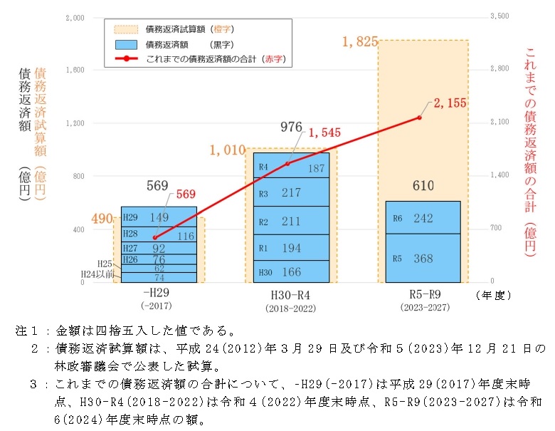 国有林野事業の債務返済額が2023年度は368億円に増え、2013年度の一般会計化以降では最高額になった。 2013年度に国有林野事業特別会計を廃止して一般会計化した際、1兆2,721億円に膨