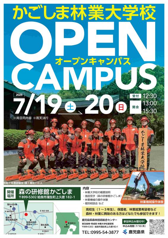 4月に開校した「かごしま林業大学校」(鹿児島県姶良市)は、7月19日(土)・20日(日)にオープンキャンパスを開催する。同校の概要説明や施設見学、林業機械の操作体験、個別相談会などを行う。高校生、保