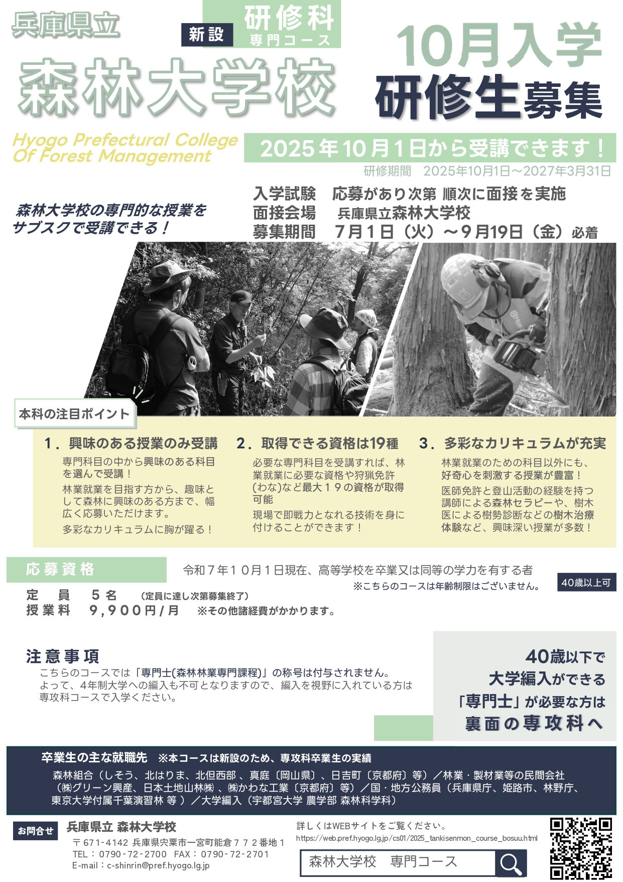 兵庫県立森林大学校(宍粟市)は、来年(2026年)3月8日(日)に開催するオープンキャンパスに先立ち、在校生の現地研修や発表会などを見学できる「誰でもオープンキャンパス」を3回実施する。開催日は、1
