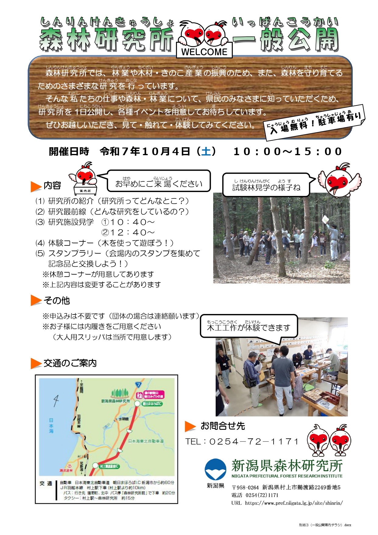 新潟県森林研究所(新潟県村上市)は、10月4日(土) 午前10時から今年度(2025年度)の一般公開を実施する。試験林・苗畑・きのこ栽培棟の見学や、木を使って作って遊ぶ体験コーナー、研究所内を巡るス