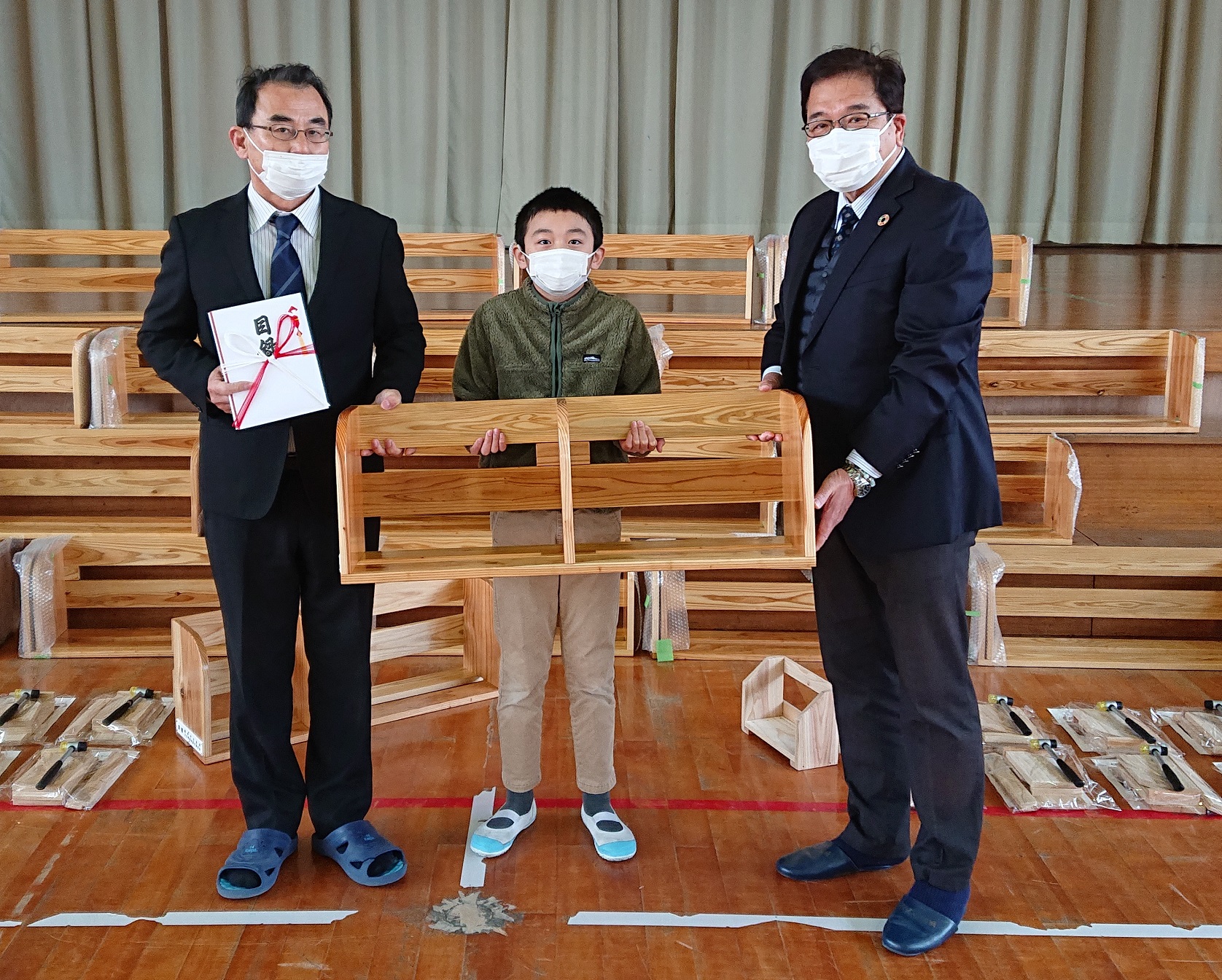 大分県森連と農林中金が挟間小学校にスギ本棚作成キットを贈る
