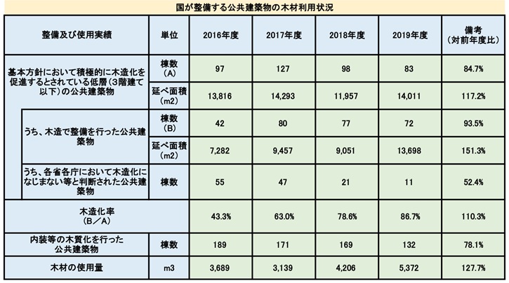 国(中央省庁)が整備する低層公共建築物(3階建て以下)の木造化率が3年連続で上昇し、2019年度は86.7%と前年度を8.4ポイント上回った。また、「木造化になじまない」と判断された物件を検証した後