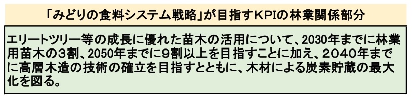林野庁は、2050年までに林業用苗木の9割以上をエリートツリーにする目標を設定した。農林水産省が新たに策定する「みどりの食料システム戦略」の中に明記し、成長に優れた苗木の普及を加速化する。 同