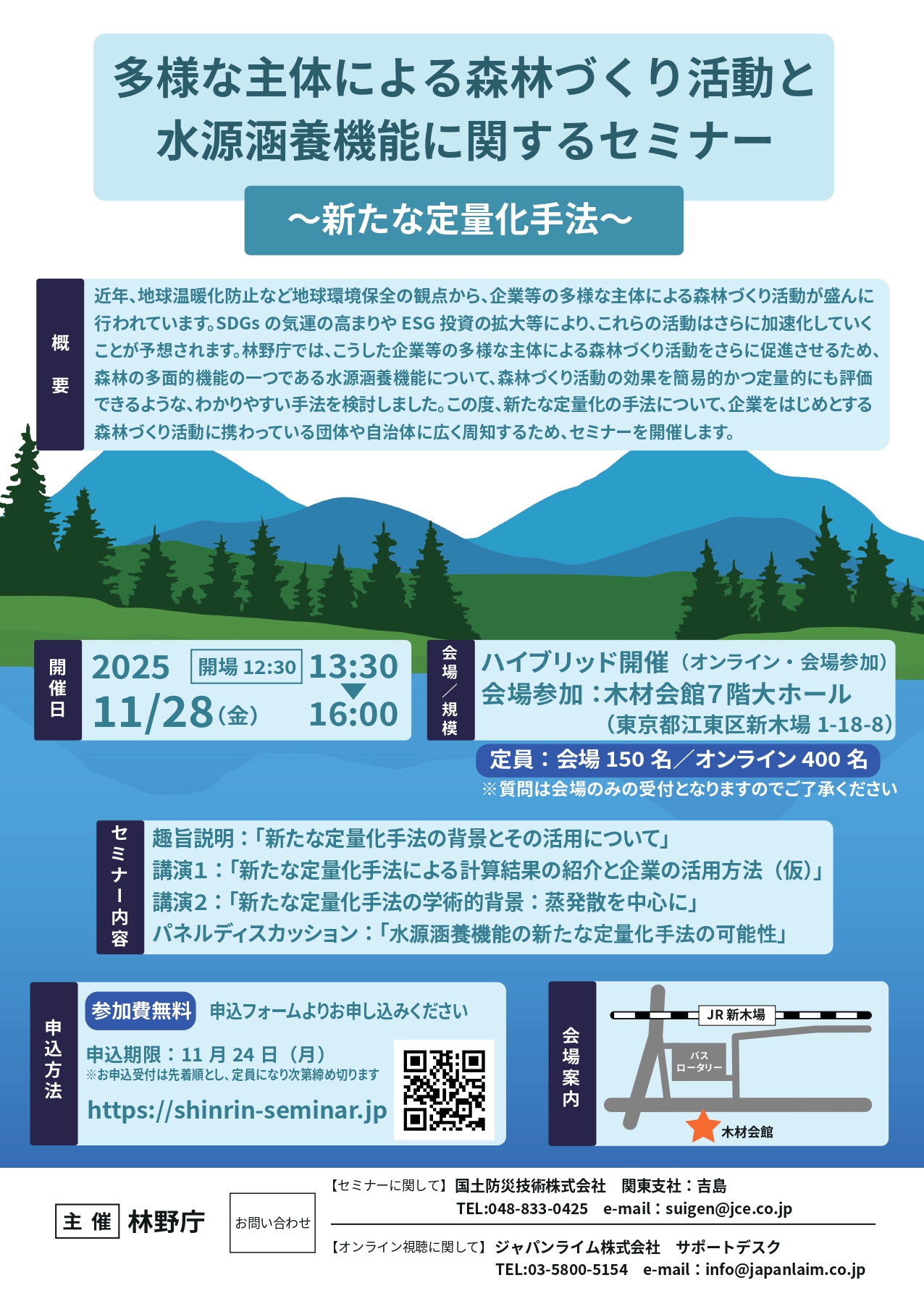 林野庁は、11月28日(金)午後1時30分から東京都江東区の木材会館で「多様な主体による森林づくり活動と水源涵養機能に関するセミナー~新たな定量化手法~」を開催し、オンライン配信も行う。森林の水源涵