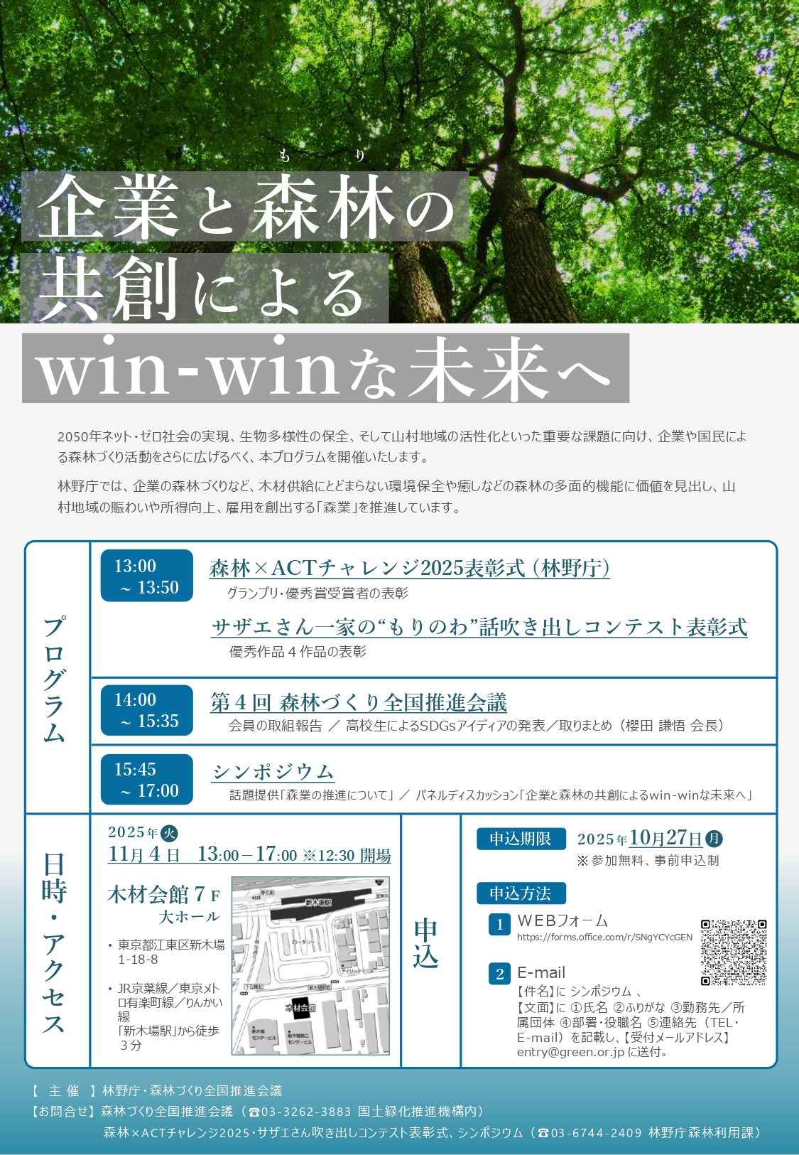 林野庁は、11月4日(火)午後1時から東京都江東区の木材会館で、「森林×ACTチャレンジ2025」と「サザエさん一家の“もりのわ”話吹き出しコンテスト」の表彰式に続き、「第4回森林づくり全国推進会議