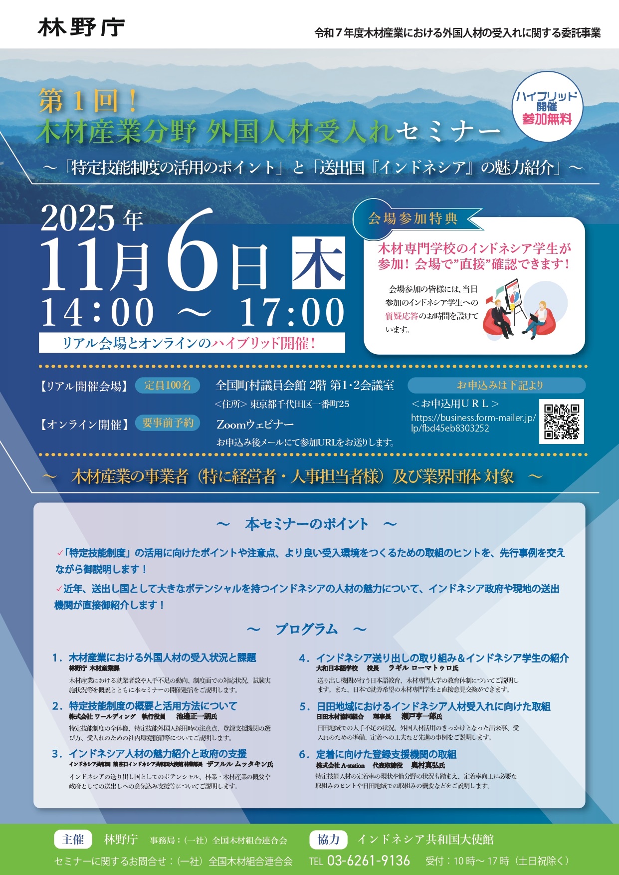 林野庁と全国木材組合連合会は、11月6日(木)午後2時から東京都千代田区の全国町村議員会館で「第1回木材産業分野外国人材受入れセミナー」を開催し、オンライン配信も行う。特定技能制度を活用する際のポイ