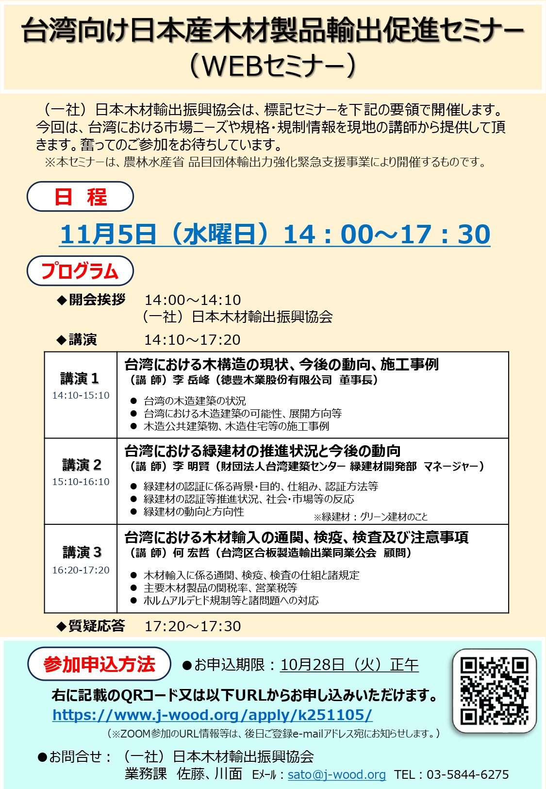 11月5日にオンラインで「台湾向け木材製品輸出促進セミナー」