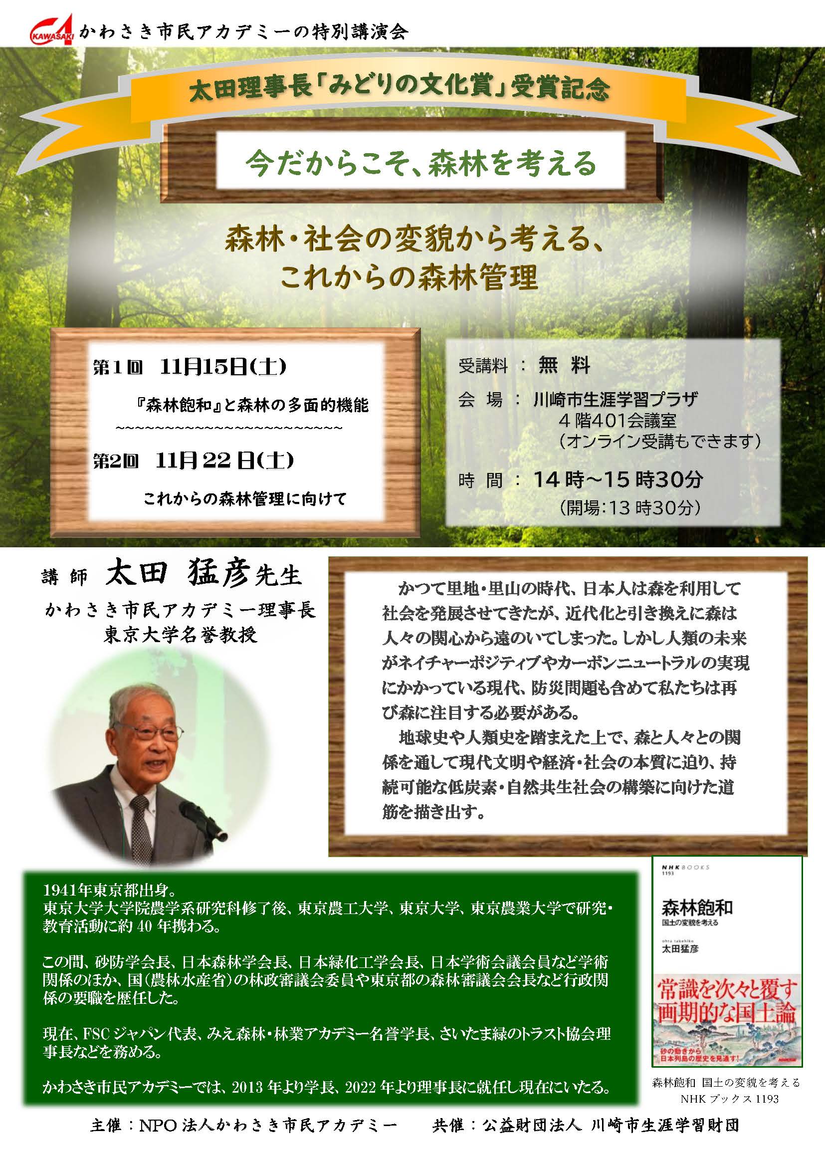 11月15・22日に太田猛彦・かわさき市民アカデミー理事長の「みどりの文化賞」受賞記念講演会