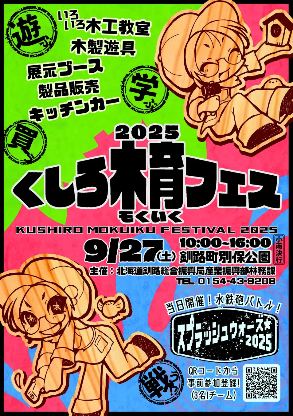 北海道釧路総合振興局は、9月27日(土)に釧路町別保公園で「くしろ木育フェスティバル2025」を開催する。木製ゴム鉄砲づくりや木の人形づくりのほか、森林内での水鉄砲バトルや親子で行うネイチャーゲーム