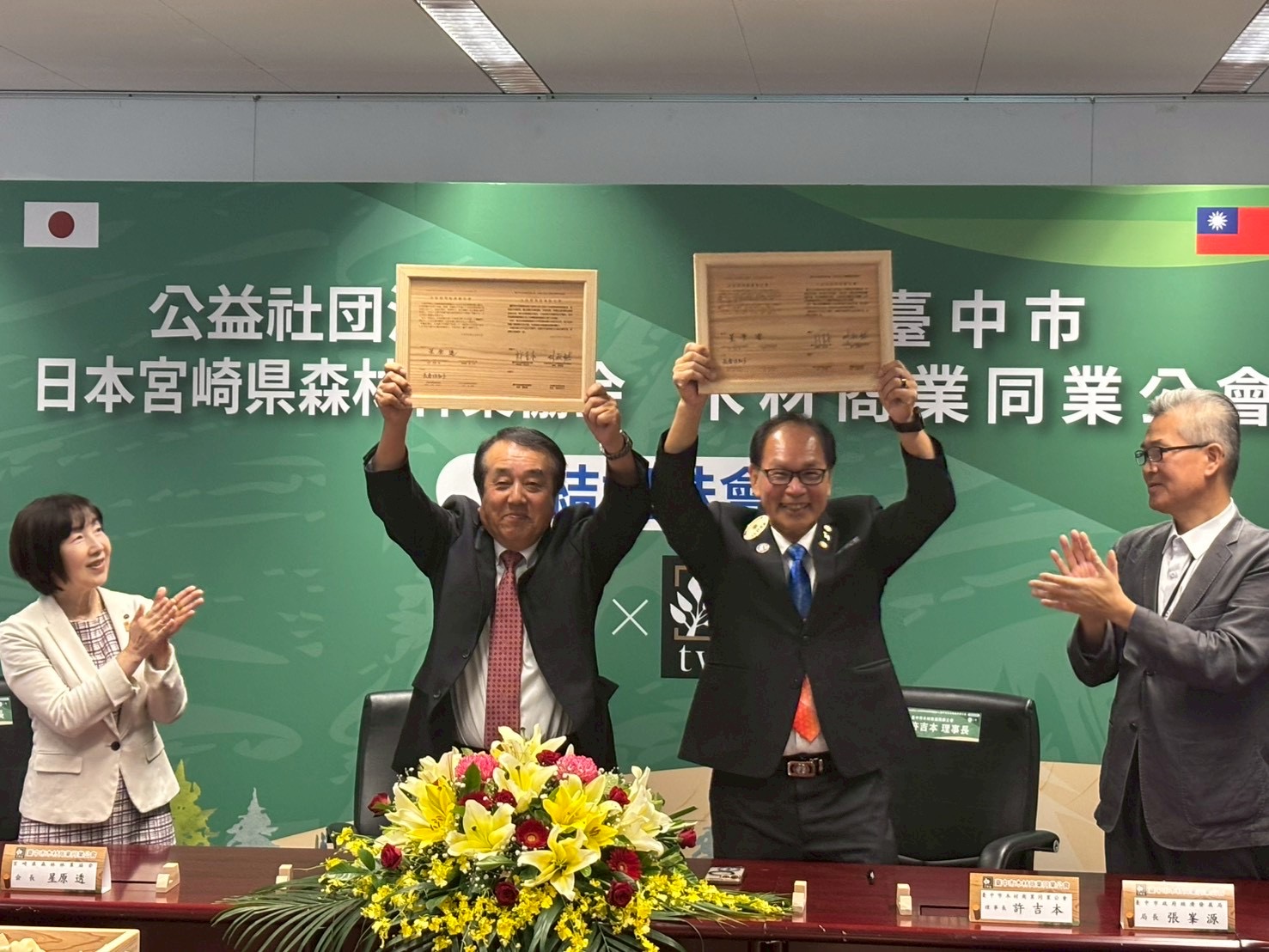 宮崎県森林林業協会(星原透会長)と台湾の台中市木材商業同業公會(許吉本理事長)は、10月3日に木材利用や木育の促進などを目的とした協定を結んだ。同日、台中市政府庁舎で協定締結式を行い、宮崎県の長倉佐