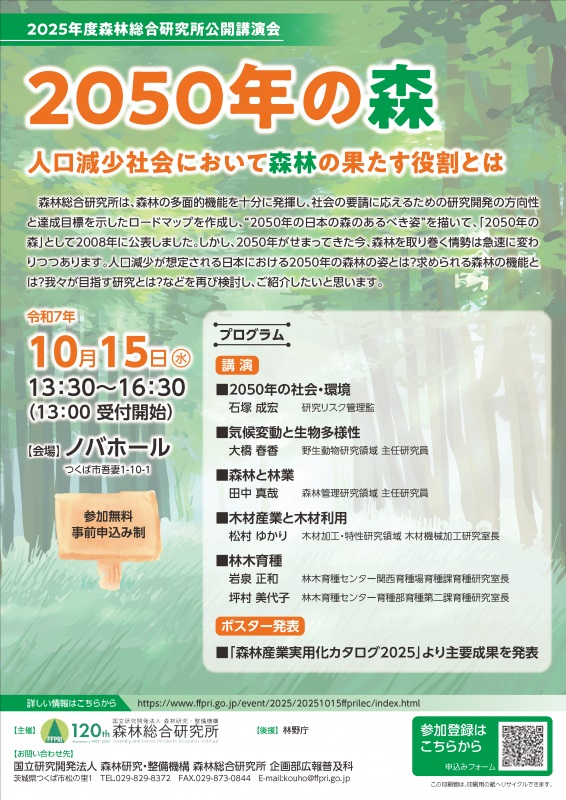 10月15日に森林総研公開講演会「2050年の森:人口減少社会において森林の果たす役割とは」
