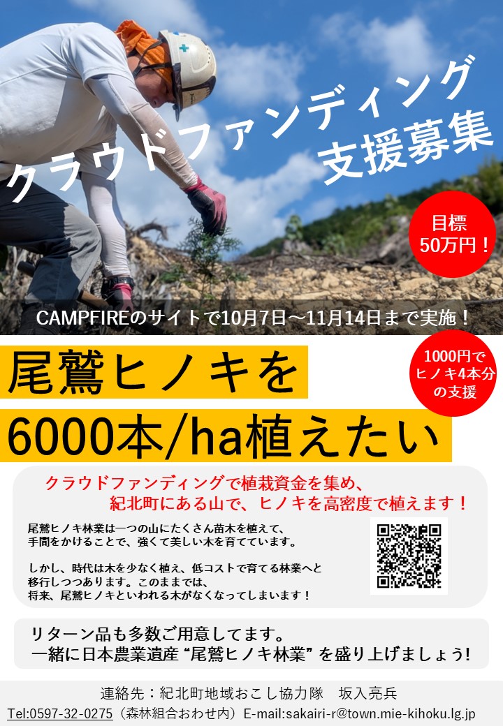 三重県紀北町の地域おこし協力隊員・坂入克兵氏と森林組合おわせは、尾鷲ヒノキをha当たり6,000本植栽するための費用をクラウドファンディングで11月14日(金)まで募っている。目標金額は50万円。1