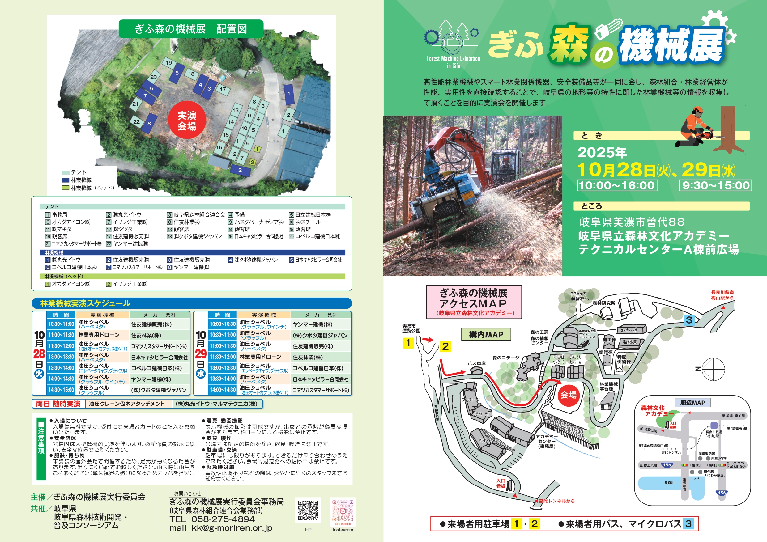 10月28日(火)・29日(水)に岐阜県美濃市の岐阜県立森林文化アカデミーで「ぎふ森の機械展」が開催される(実行委員会主催)。高性能林業機械やスマート林業関係機器の実演などを通じて、同県の地形条件な