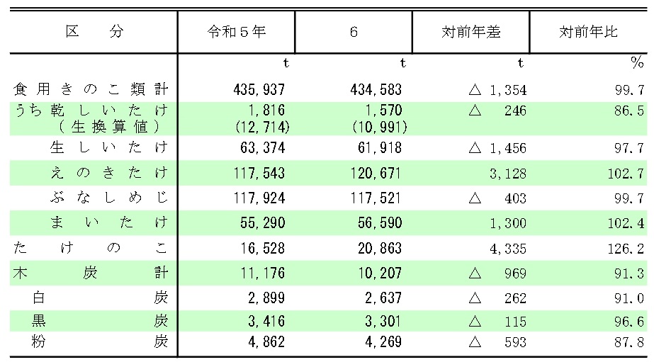 農林水産省は、昨年(2024年)の「特用林産物生産統計調査結果」を7月29日に公表した。食用きのこ類の生産量は43万4,583tで、前年比で1,354t(0.3%)減少した。食用きのこ類の中で生産量