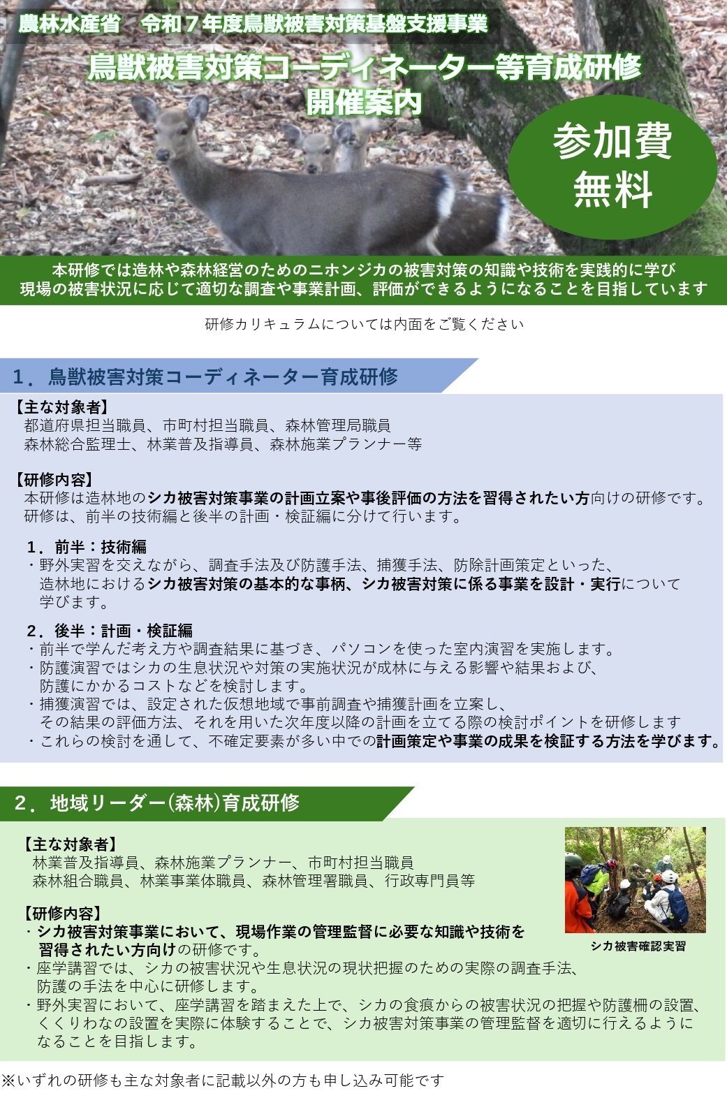 (株)野生鳥獣対策連携センターは、今年度(2025年度)の「鳥獣被害対策コーディネーター等育成研修」と「地域リーダー(森林)育成研修」を10月から来年(2026年)1月にかけて全国9か所で実施する。