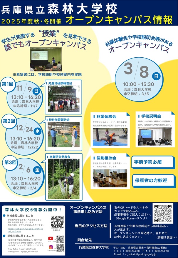兵庫県立森林大学校(宍粟市)は、来年(2026年)3月8日(日)に開催するオープンキャンパスに先立ち、在校生の現地研修や発表会などを見学できる「誰でもオープンキャンパス」を3回実施する。開催日は、1
